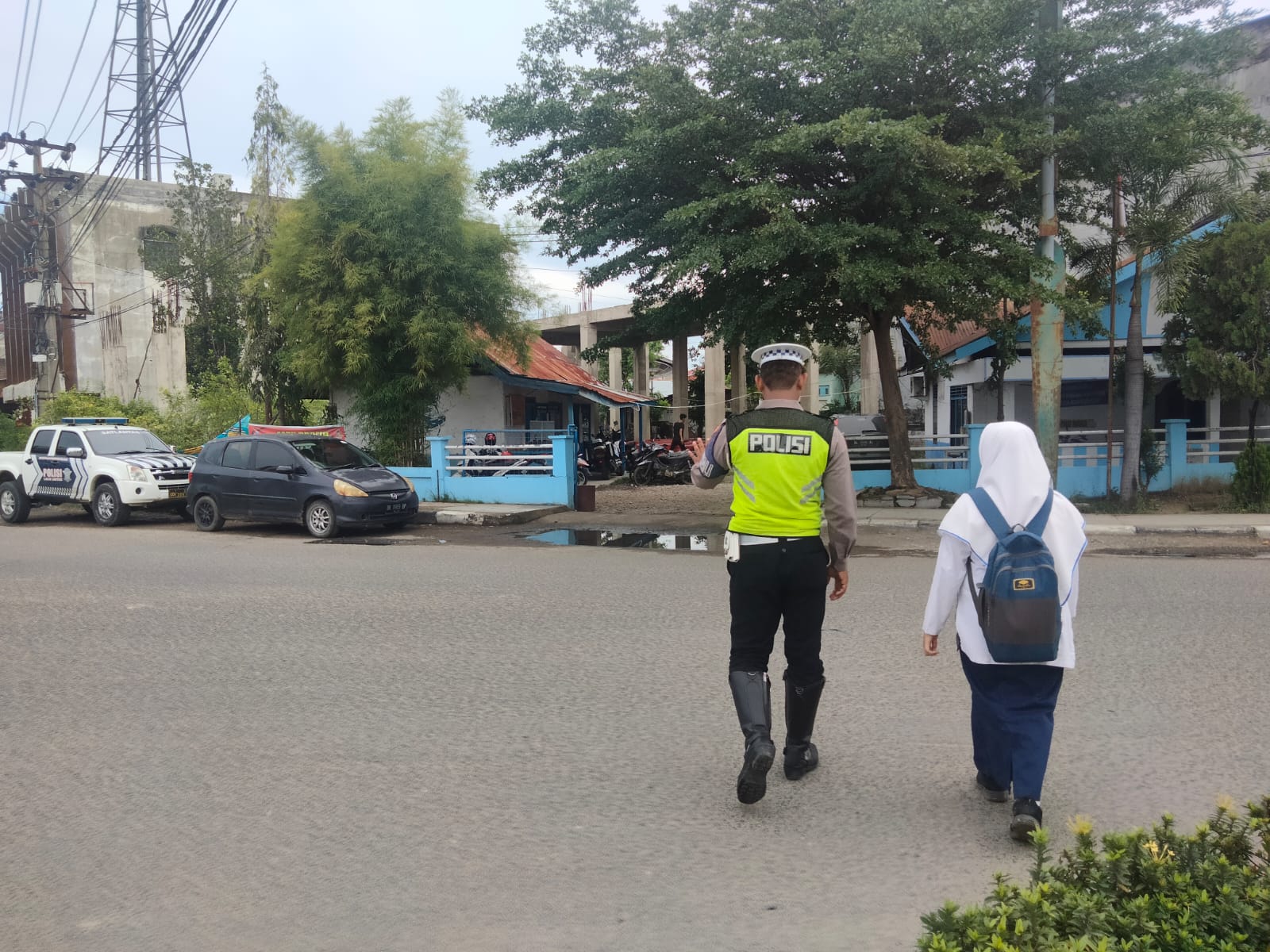 LHOKSEUMAWE - Polisi lalulintas (Polantas) Lhokseumawe melaksanakan strong poin dan memberi pelayanan kepada siswa SMPN 7 Kota Lhokseumawe, Selasa (29/11/2022) siang.
