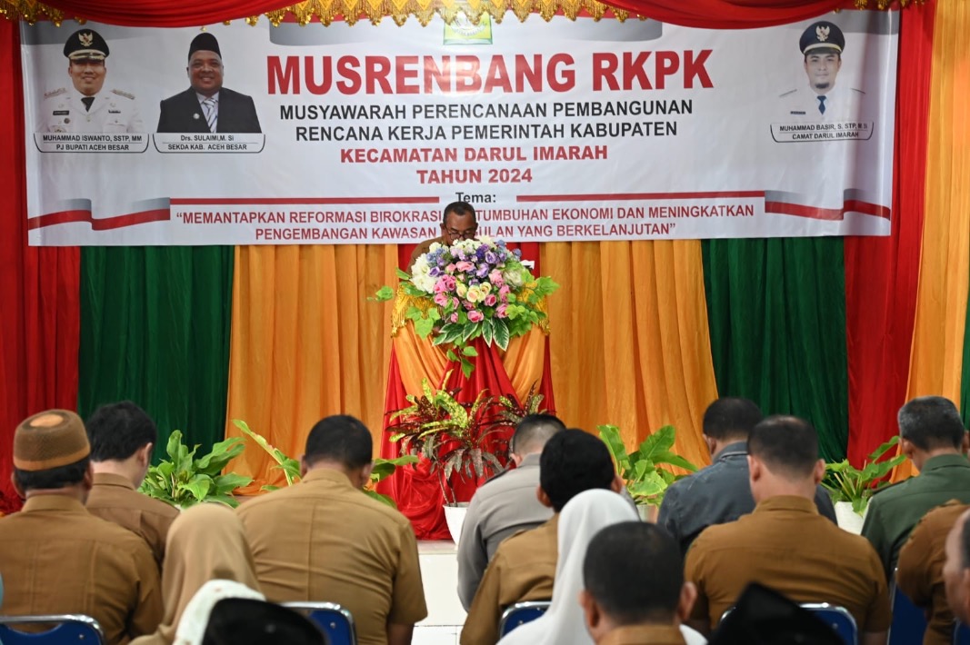 Musrenbang yang bertema "Memantapkan reformasi birokrasi pertumbuhan ekonomi dan meningkatkan pembangunan kawasan unggulan yang berkelanjutan,” berlangsung di Aula UDKP Kecamatan Darul Imarah, Kabupaten Aceh Besar, Senin (25/3/2024).