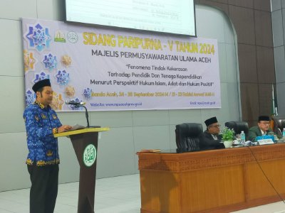 Banda Aceh - Hukum melakukan tindakan kekerasan dalam bentuk apapun terhadap pendidik atau tenaga kependidikan hukumnya haram. Hal itu tertuang dalam salah satu poin Rancangan Fatwa Majelis Permusyawaratan Ulama (MPU) Aceh yang dibacakan Kabag. Persidangan MPU Aceh, Ahmad Taufik, Lc saat penutupan Sidang Paripurna di Gedung Tgk. H. Abdullah Ujong Rimba MPU Aceh, Kamis (26/9/2024)