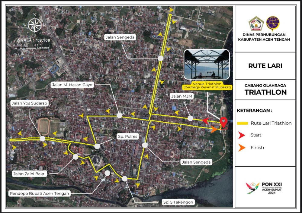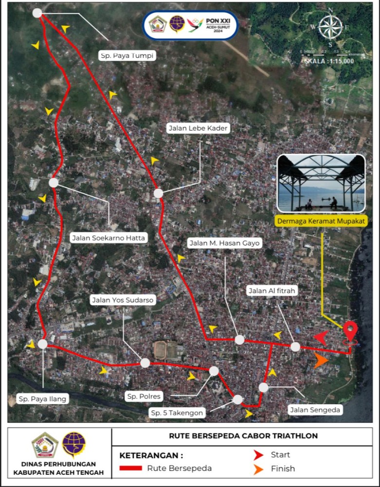 Takengon - Perlombaan Triathlon dalam ajang Pekan Olahraga Nasional (PON) XXI Aceh-Sumut akan resmi dimulai besok, Selasa 10 September 2024, pukul 09.00 WIB di Dermaga Al Fitrah, Kampung Keramat Mufakat, Kecamatan Bebesen, Kabupaten Aceh Tengah. Kepala Dinas Perhubungan Kabupaten Aceh Tengah, Jauhari, ST, pada Senin (9/9/2024) menyampaikan Pengamanan dan Rekayasa Lalin yang sudah disiapkan mengingat Perlombaan ini akan melibatkan tiga cabang olahraga sekaligus, yakni renang, bersepeda, dan lari, dengan rute yang melintasi tiga kecamatan, yaitu Kecamatan Lut Tawar, Kecamatan Bebesen, dan Kecamatan Kebayakan.