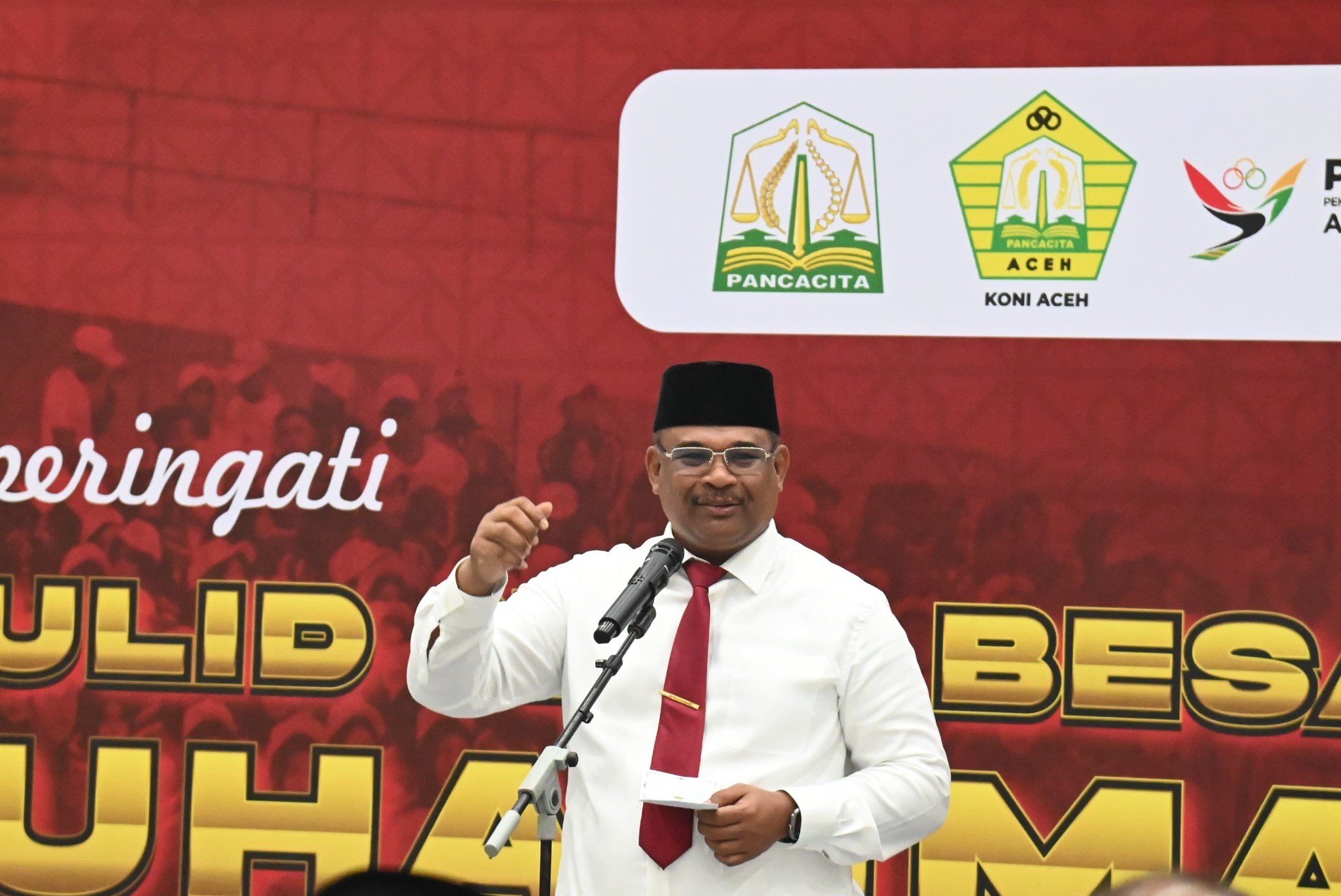 Pj Bupati Aceh Besar Muhammad Iswanto SSTP MM menghadiri Peringatan Maulid Nabi Muhammad SAW dan Syukuran kontingen Aceh Prestasi Atlet pada PON XXI Aceh - Sumut 2024, di GOR KONI Aceh, Banda Aceh, Selasa (24/09/2024).FOTO/MC ACEH BESAR