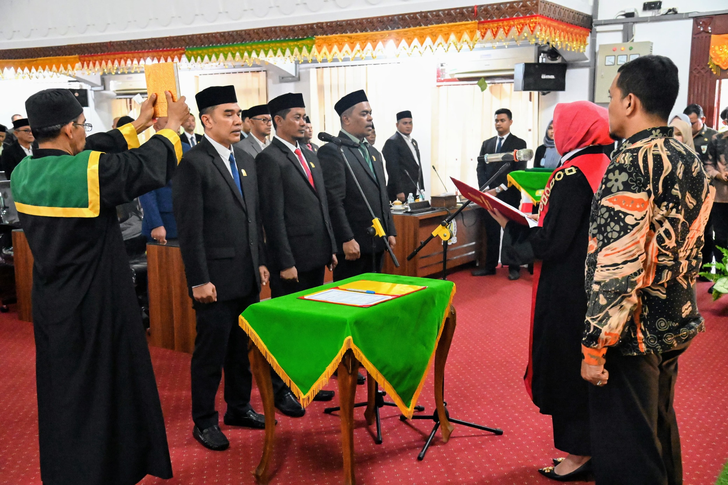 KOTA JANTHO – Penjabat (Pj) Bupati Aceh Besar, Muhammad Iswanto SSTP MM, menghadiri Rapat Paripurna Pengucapan Sumpah Pimpinan Dewan Perwakilan Rakyat Kabupaten (DPRK) Aceh Besar periode 2024-2029, di Ruang Paripurna DPRK Aceh Besar, Kota Jantho, Kabupaten Aceh Besar, Jumat (27/9/2024).