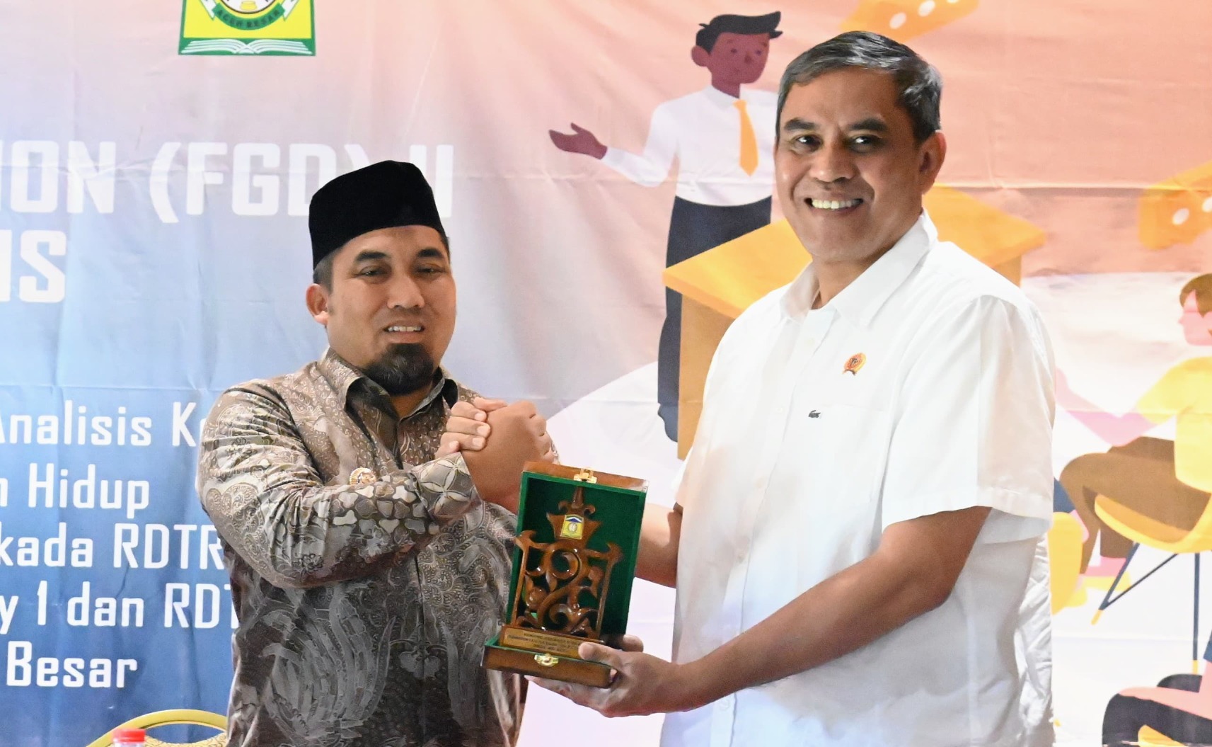 KOTA JANTHO - Penjabat (Pj) Bupati Aceh Besar Muhammad Iswanto S.STP, MM menyambut Direktur Bina Perencanaan Tata Ruang Daerah (BPTD) Wilayah I, Kementerian ATR/BPN, Drs. Pelopor, M.Eng.Sc, pada acara Focus Group Discussion (FGD) II Rencana Detail Tata Ruang (RDTR) dan Kajian Lingkungan Hidup Strategis (KLHS) di The Pade Hotel, Kecamatan Darul Imarah, Aceh Besar, Kamis (26/9/2024).