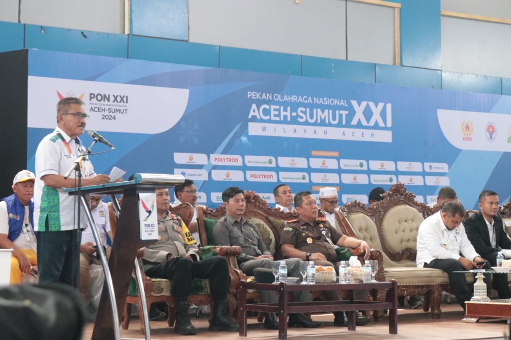 Pj Bupati Aceh Besar Muhammad Iswanto saat membuka secara resmi cabang olahraga Kurash pada Pekan Olahraga Nasional (PON) XXI Aceh-Sumut yang dilangsungkan di Gedung Hall A JSC Kota Jantho, Aceh Besar, Rabu (11/09/2024). FOTO/MC ACEH BESAR.