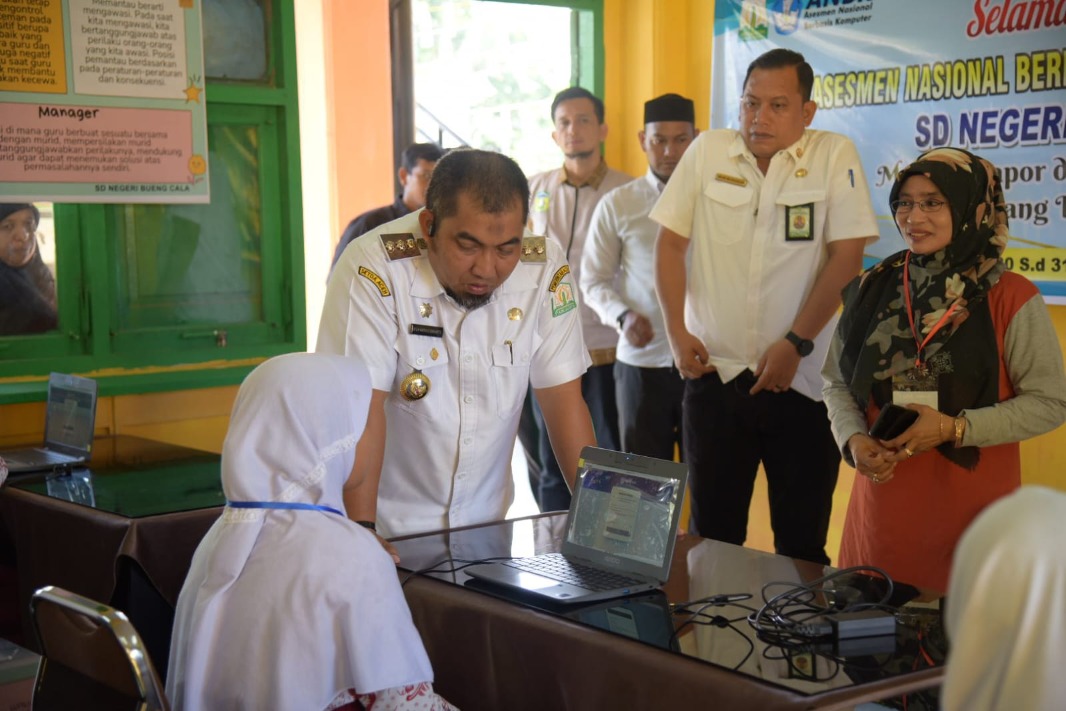 Pj Bupati Aceh Besar, Muhammad Iswanto, SSTP, MM, didampingi Kadisdikbud Aceh Besar, Bahrul Jamil, SSos, MSi, meninjau pelaksanaan ANBK jenjang SD di SDN Bungcala, Kecamatan Kuta Baro, Rabu (30/10/2024). FOTO/MC ACEH BESAR