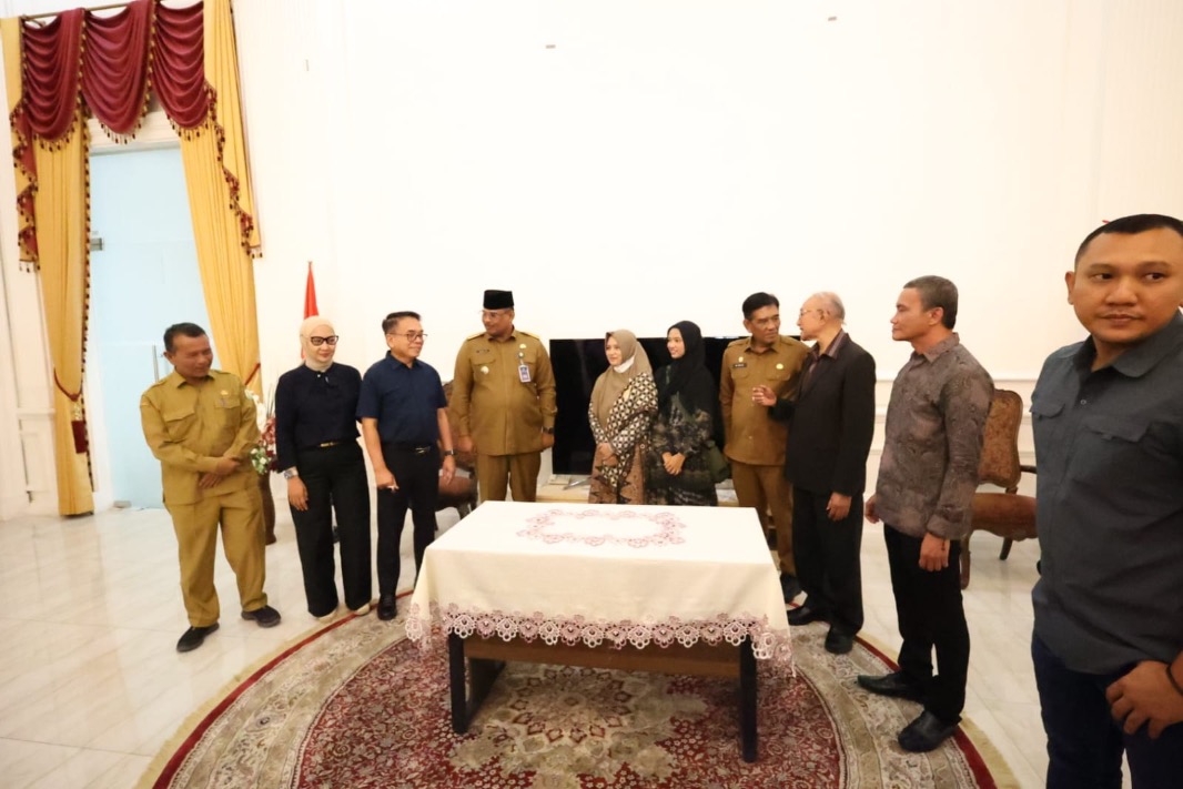 Pj. Gubernur Aceh, Wali Nanggroe, Kadinsos Aceh, dan para Kepala SKPA dan Kepala Biro serta Keluarga Ahli Waris Laksamana Keumalahayati berfoto bersama usai serah terima Hibah Aset Milik Pemerintah Aceh. Selasa, 11/02/2025 di Meuligoe Wali Nanggroe.