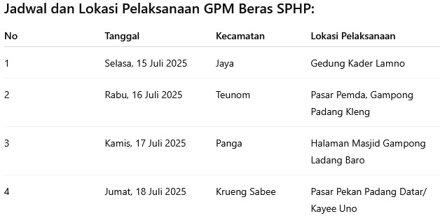 Total sebanyak 13.000 kilogram (13 ton) beras SPHP akan disalurkan secara bertahap melalui GPM ke empat kecamatan di Aceh Jaya mulai Selasa, 15 Juli hingga Jumat, 18 Juli 2025. Masyarakat diharapkan dapat memanfaatkan kegiatan ini untuk mendapatkan beras berkualitas dengan harga terjangkau.